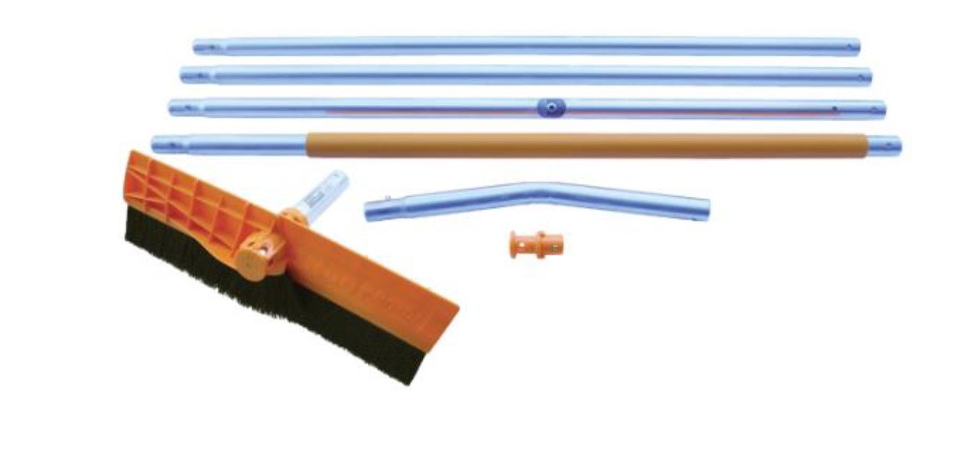 A versatile lightweight solution to clear off your roof, solar panel, RV, semi-truck, hot tub or pool cover, or vehicle. Broom, scraper and adjustable angle are the best multi-purpose tool. Brush head is 18 inches wide, includes three 4-foot pole sections, one rubber 4-foot pole handle, one angle pole section, and the Roof Brush Multi-tool head.